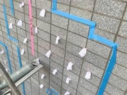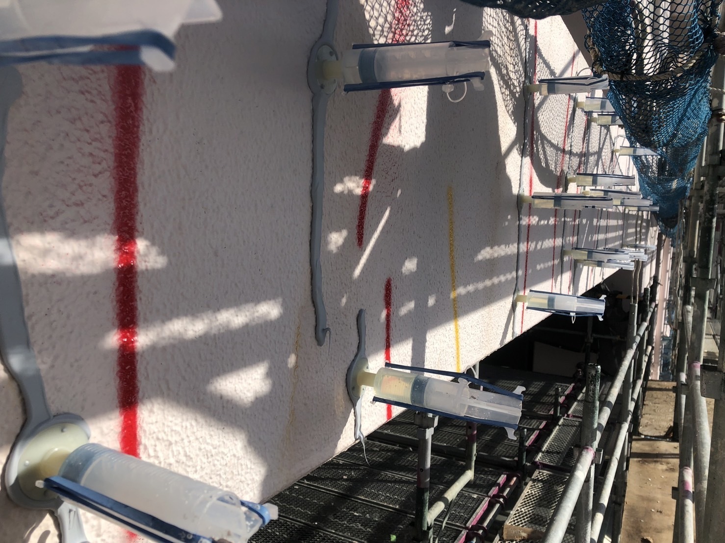 浮きが発生している箇所にエポキシ樹脂などの接着剤を満遍なく充填し、補強用のステンレスピンを埋め込んで浮き部全体をアンカーピンと接着剤で固定させる工法